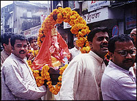 to the festival site on the day of Ganesh Chaturthi in a solemn